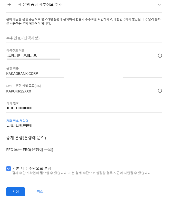 3. 각 항목에 입력하고 '기본 지급 수단으로 설정'에 체크하고 '저장'을 클릭합니다.