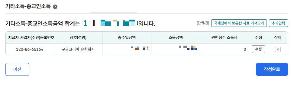 기타소득이 정상적으로 등록되었는지 금액 한번 더 확인해 주세요. 확인 후 '작성완료' 버튼을 클릭해 주세요.