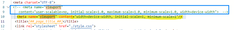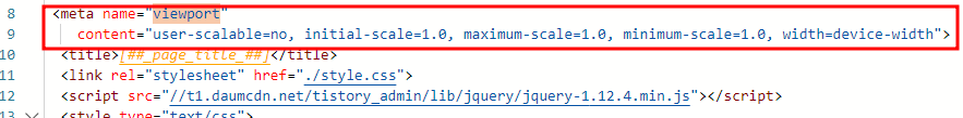 기존 빨간색 네모박스 안의 내용 앞 뒤에 위의 파란색 네모박스와 같이 수정(앞에는 '<!--' , 뒤에는' -->' 입력)   그다음 줄에 노란색 형광펜처럼 새 코드( <meta name="viewport" content="width=device-width, initial-scale=1, minimum-scale=1"/> ) 입력  → '적용'클릭하면 완성입니다.