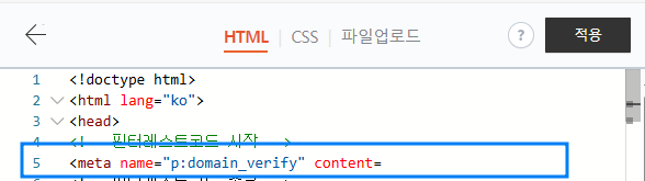 9단계 : 적용할 티스토리에 접속 후 계정관리 - 꾸미기 - 스킨편집 - html편집 순으로 클릭하여 8단계에서 복사한 코드를 <head> 항목 바로 아래에 붙여 넣은 후 적용 클릭하기