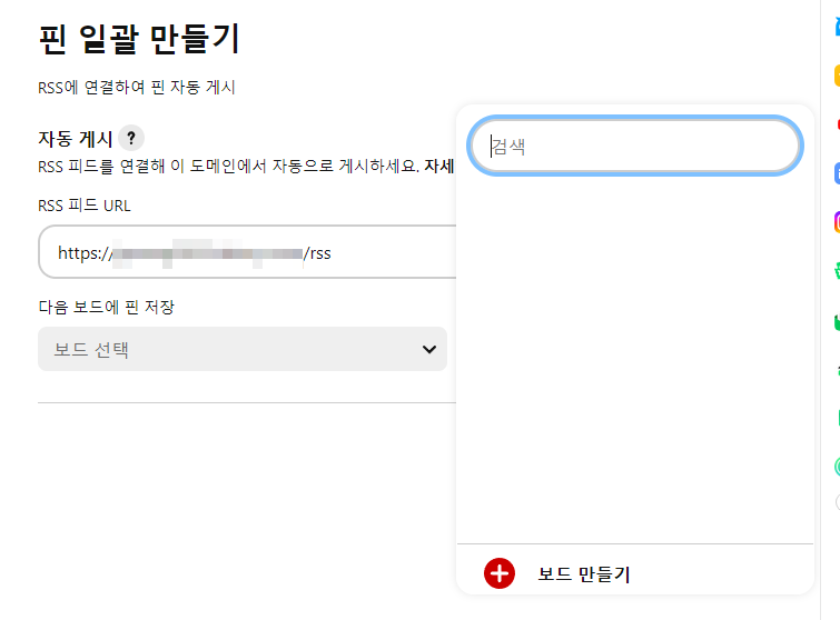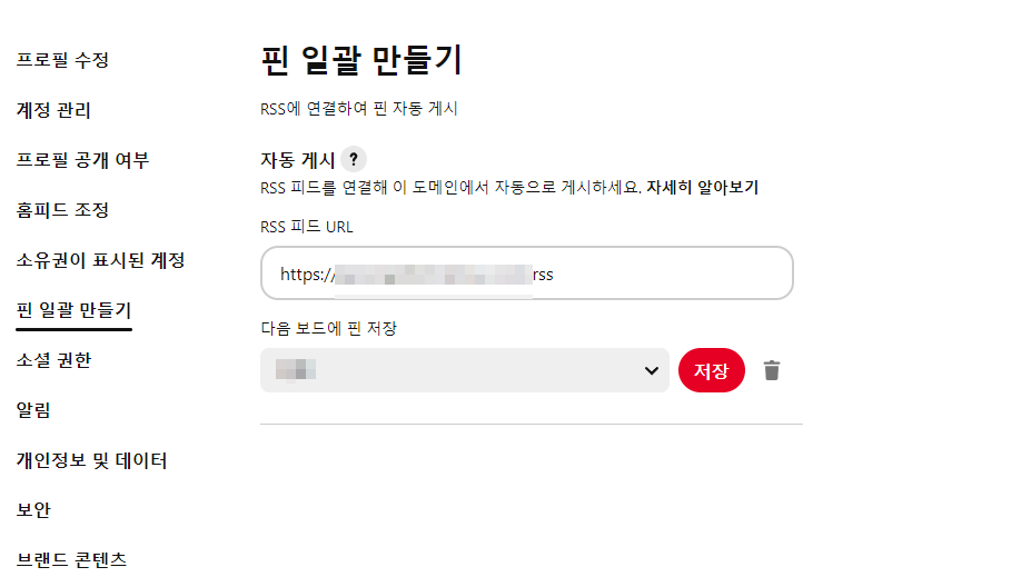 11단계 " 설정 메뉴에서 '핀 일관 만들기' 클릭 → RSS 피드 URL에 주소 입력   다음 보드에 핀을 저장 클릭 후 사이트와 연결할 보드 선택   저장 클릭