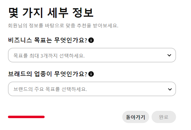 6단계 : 비즈니스 목표는 티스토리 외부유입이 목표이기 때문에 '사이트 트래픽 유도하기'로, 브랜드 업종은 '기타'로 설정 후 완료 버튼 클릭하기