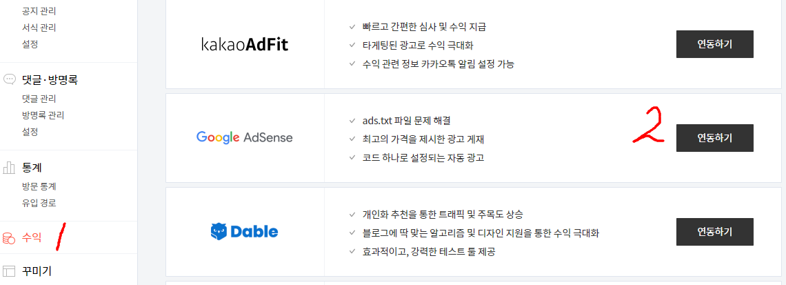 ● 블로그 관리 - 수익 - 구글 애드센스 연동하기 순으로 클릭합니다.